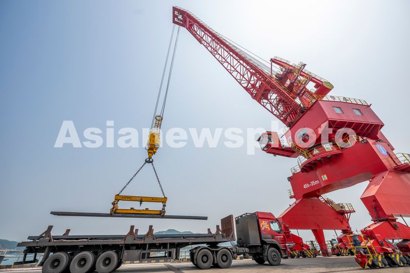 2025年4月3日,广西梧州临港经济区赤水港码头,卡车往来穿梭,吊机正在装卸作业,现场一片繁忙。