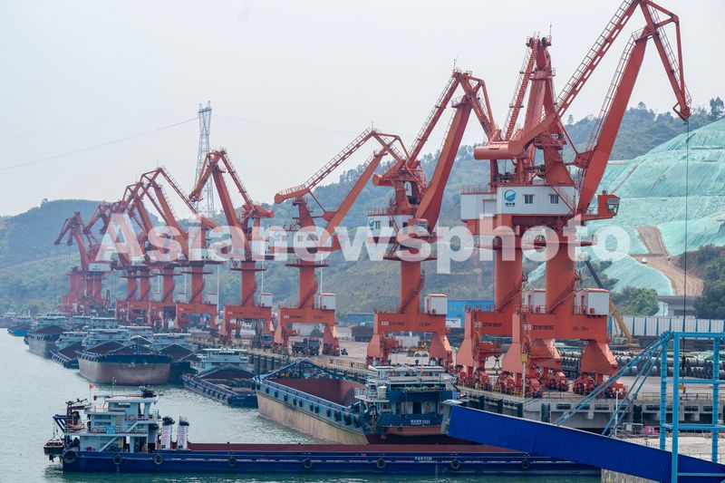 2025年4月3日,广西梧州临港经济区赤水港码头,卡车往来穿梭,吊机正在装卸作业,现场一片繁忙。