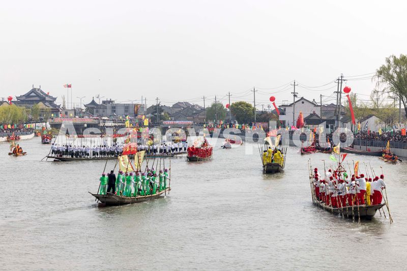 2025年4月4日,选手在参加茅山会船。 当日是清明节,江苏省兴化市举行一年一度的茅山会船盛会,船只和选手齐聚茅山西大河,参加竞技和表演。茅山会船始于南宋,现已被列入国家级非物质文化遗产名录。