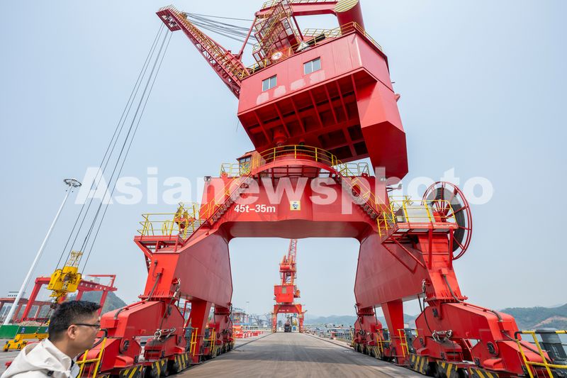 2025年4月3日,广西梧州临港经济区赤水港码头,卡车往来穿梭,吊机正在装卸作业,现场一片繁忙。