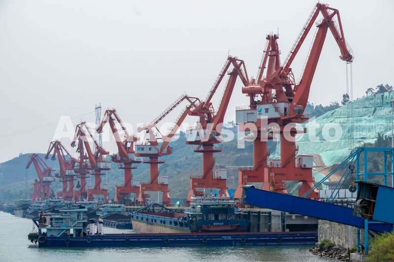 2025年4月3日,广西梧州临港经济区赤水港码头,卡车往来穿梭,吊机正在装卸作业,现场一片繁忙。
