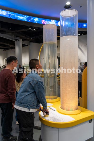 图片说明:2025年4月6日,浙江省金华市科技馆里,青少年正在体验“泡泡的追逐赛”科普项目。