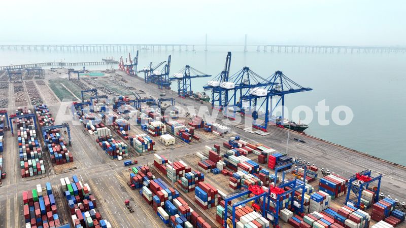 2025年4月5日,福建省石狮市蚶江镇石湖港区,货轮在泊位上有序装卸作业,码头桥吊高效运转,运输车辆往来穿梭,港口生产一派繁忙景象。