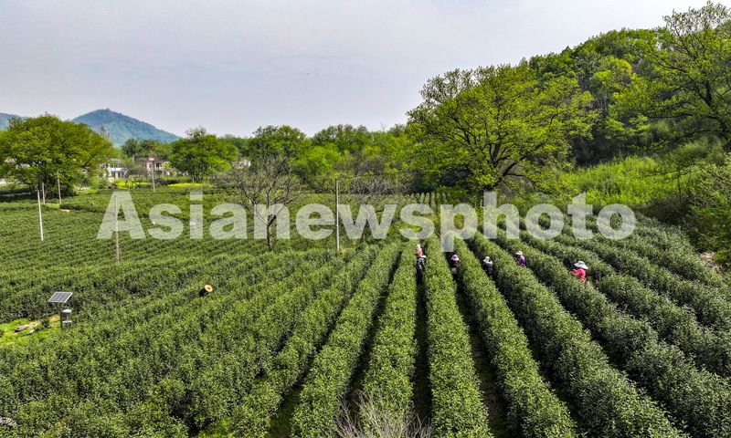 2025年4月5日,安徽省合肥市庐江县汤池镇马槽村村民抓紧春日晴好天气,正在茶山上采收谷雨节气前的“雨前茶”。
