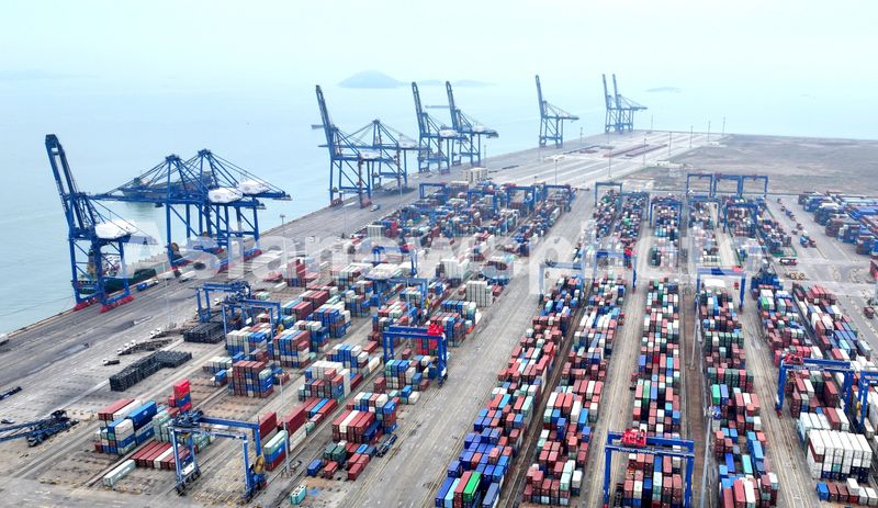 2025年4月5日,福建省石狮市蚶江镇石湖港区,货轮在泊位上有序装卸作业,码头桥吊高效运转,运输车辆往来穿梭,港口生产一派繁忙景象。