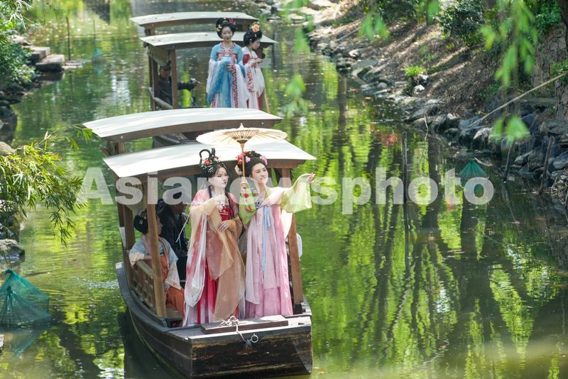 图片说明:2025年4月6日,在浙江省湖州市德清县钟管镇蠡山景区,汉服爱好者泛舟游览。