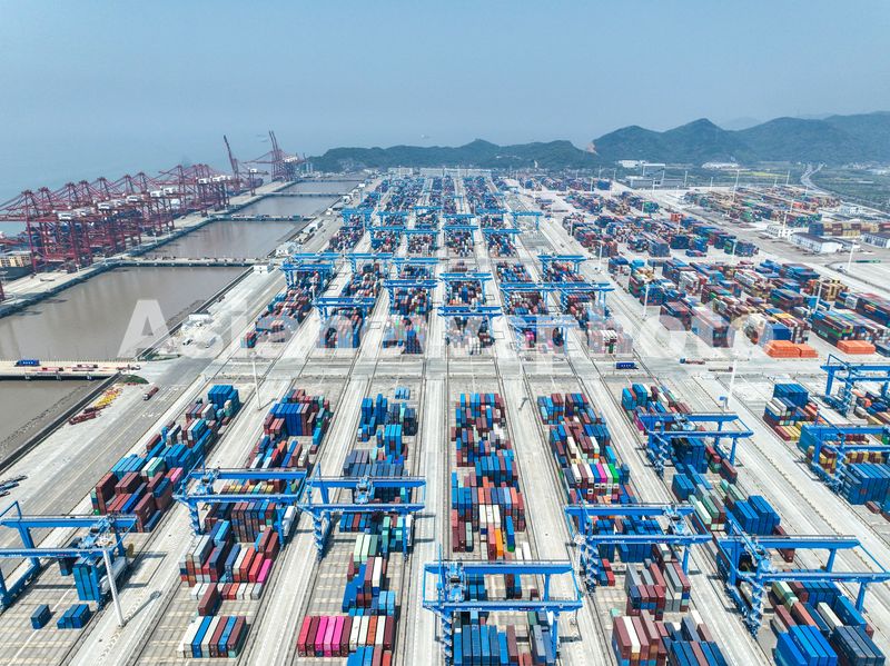 图片说明:2025年4月6日,浙江宁波舟山港金塘港区大浦口集装箱码头,货轮在泊位上有序装卸集装箱,无人驾驶卡车正在转运集装箱,一派繁忙景象。