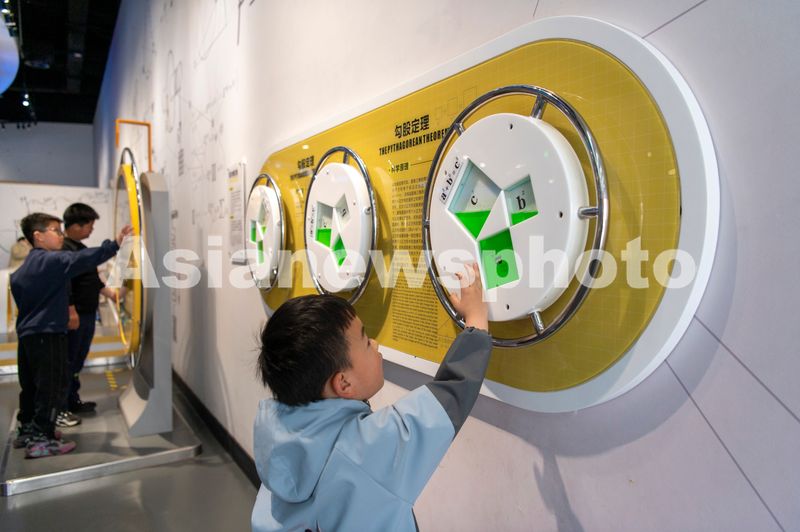 图片说明:2025年4月6日,浙江省金华市科技馆里,青少年正在体验“勾股定理”科普项目。