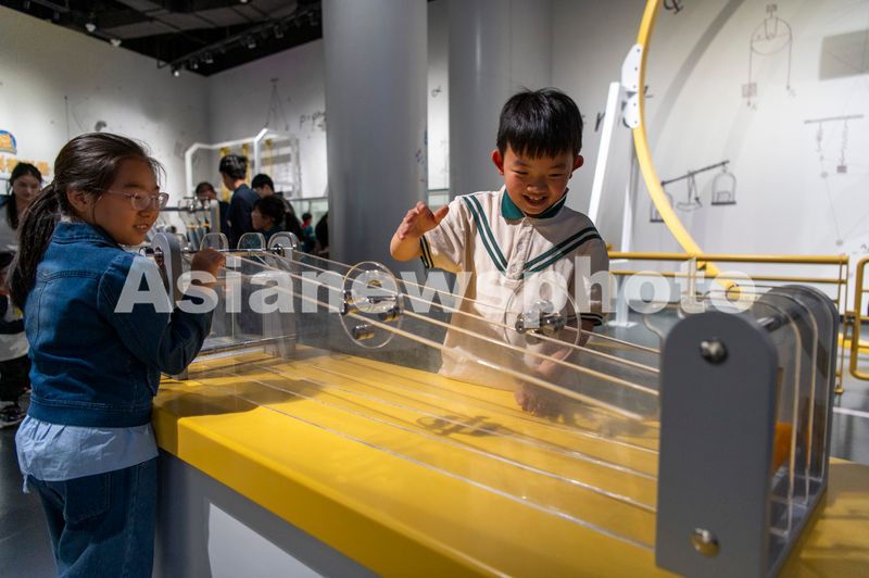 图片说明:2025年4月6日,浙江省金华市科技馆里,青少年正在体验“锥体下滚”科普项目。