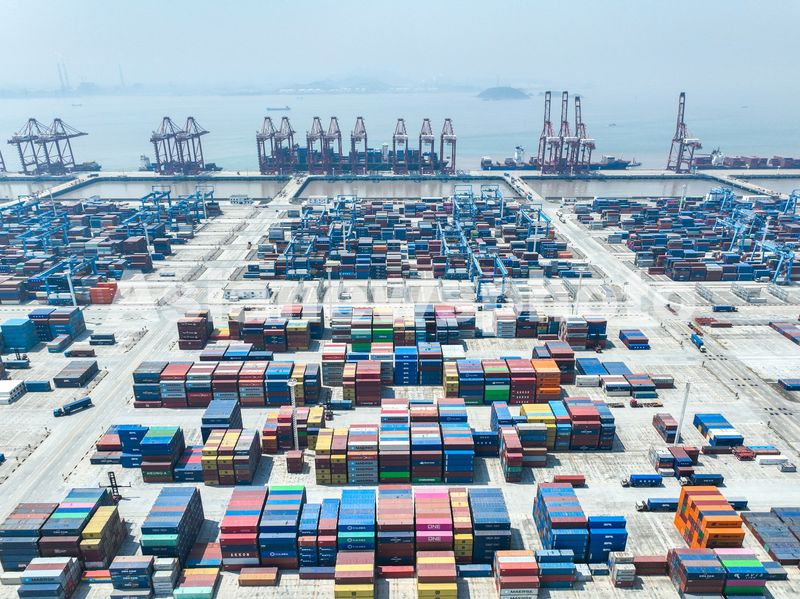 图片说明:2025年4月6日,浙江宁波舟山港金塘港区大浦口集装箱码头,货轮在泊位上有序装卸集装箱,无人驾驶卡车正在转运集装箱,一派繁忙景象。