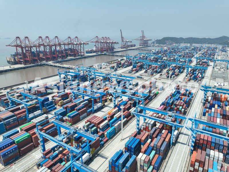 图片说明:2025年4月6日,浙江宁波舟山港金塘港区大浦口集装箱码头,货轮在泊位上有序装卸集装箱,无人驾驶卡车正在转运集装箱,一派繁忙景象。