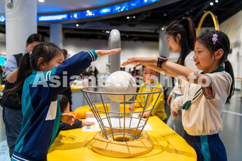 图片说明:2025年4月6日,浙江省金华市科技馆里,青少年正在体验“伯努利原理”科普项目。