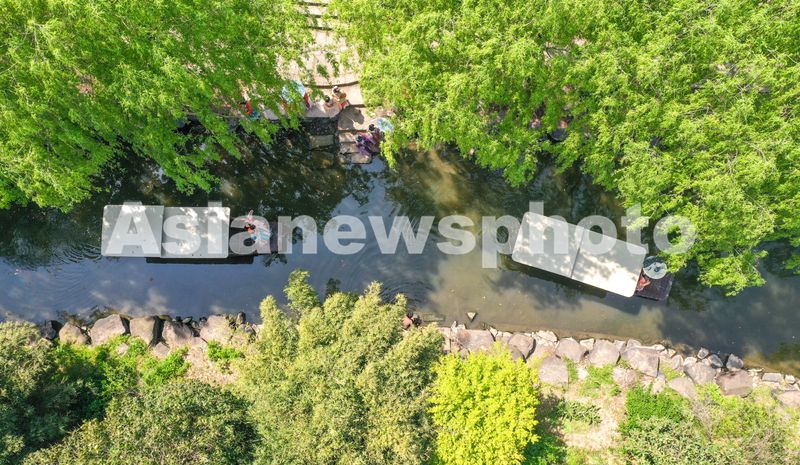 图片说明:2025年4月6日,在浙江省湖州市德清县钟管镇蠡山景区,汉服爱好者泛舟游览。