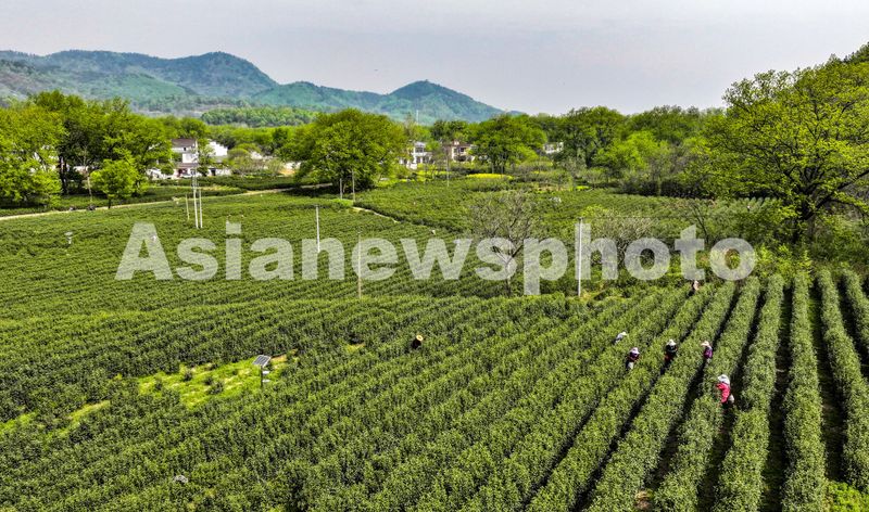 2025年4月5日,安徽省合肥市庐江县汤池镇马槽村村民抓紧春日晴好天气,正在茶山上采收谷雨节气前的“雨前茶”。