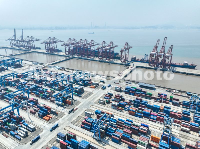 图片说明:2025年4月6日,浙江宁波舟山港金塘港区大浦口集装箱码头,货轮在泊位上有序装卸集装箱,无人驾驶卡车正在转运集装箱,一派繁忙景象。