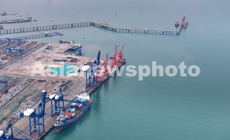 2025年4月5日,福建省石狮市蚶江镇石湖港区,货轮在泊位上有序装卸作业,码头桥吊高效运转,运输车辆往来穿梭,港口生产一派繁忙景象。。
