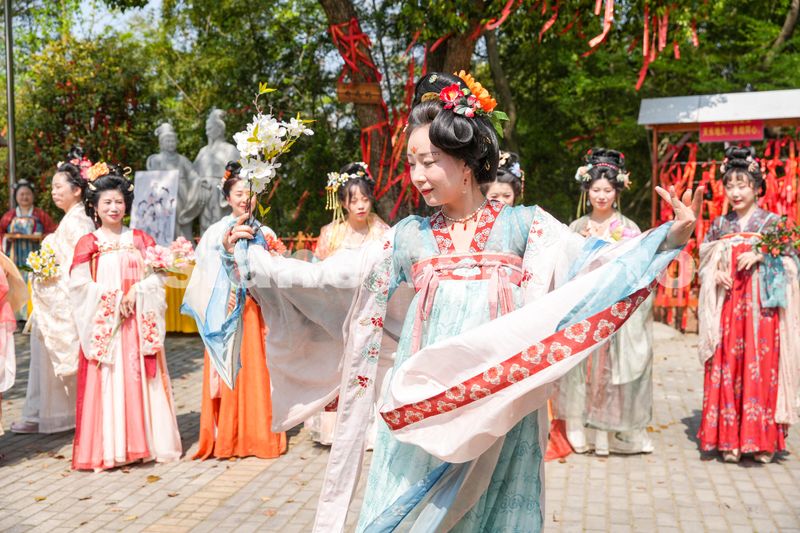 图片说明:2025年4月6日,在浙江省湖州市德清县钟管镇蠡山景区,汉服爱好者展示汉服传统服饰舞蹈。