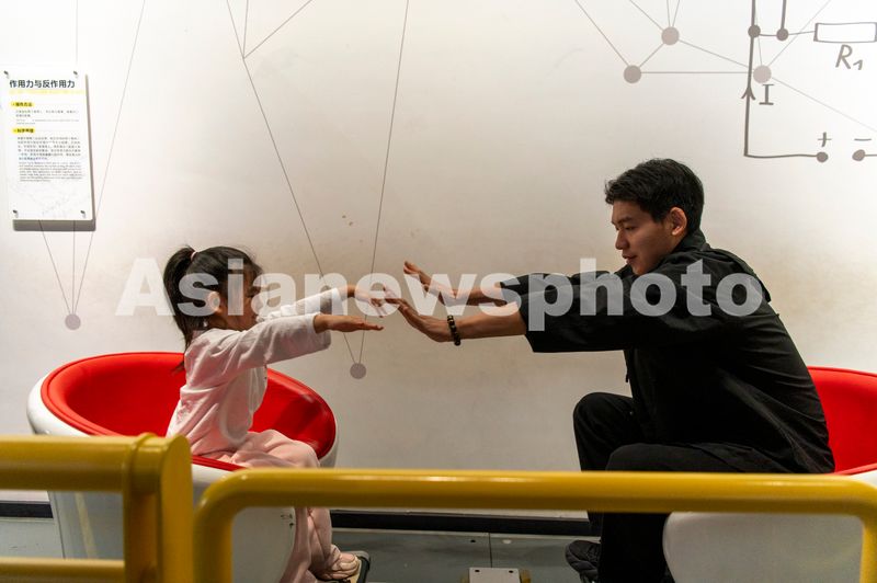 图片说明:2025年4月6日,浙江省金华市科技馆里,青少年正在体验“作用力与反作用力”科普项目。