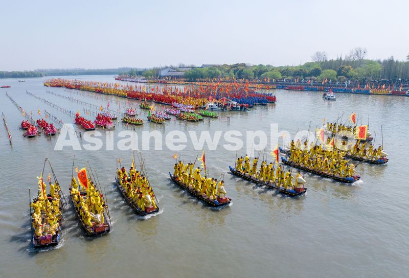 2025年4月6日,江苏泰州姜堰溱潼会船在江苏省泰州市姜堰区溱湖国家湿地公园开幕,五百多条各式船只和上万名会船选手飞篙走桨,弄潮击浪,演绎历久弥新的民俗画卷。