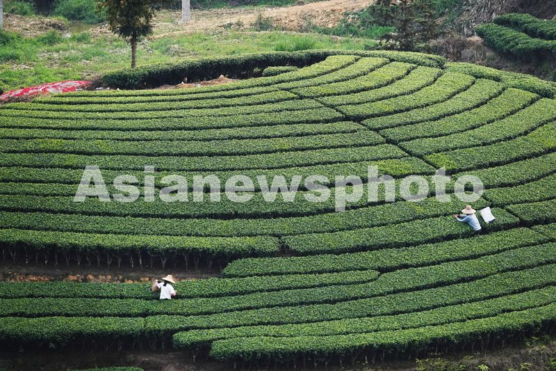 图片说明:4月5日,茶农在广西昭平县江口村生态茶园采摘春茶。