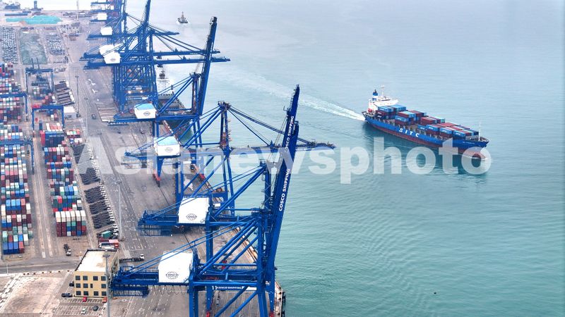 2025年4月5日,福建省石狮市蚶江镇石湖港区,货轮在泊位上有序装卸作业,码头桥吊高效运转,运输车辆往来穿梭,港口生产一派繁忙景象。