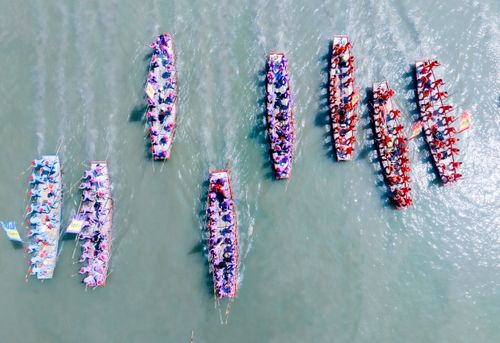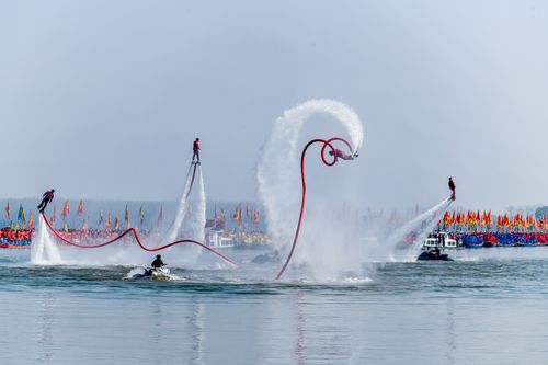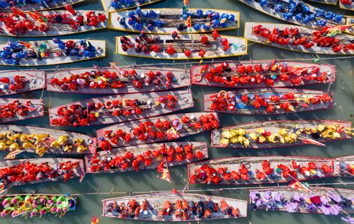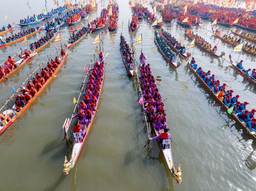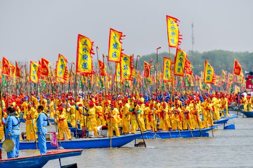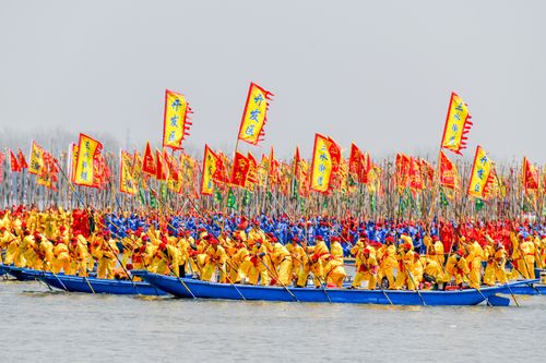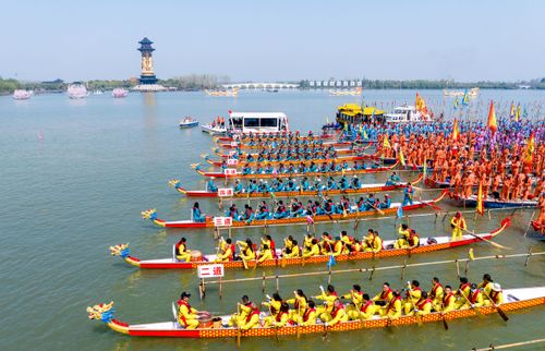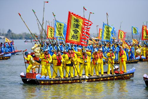2025年4月6日,江苏泰州姜堰溱潼会船在江苏省泰州市姜堰区溱湖国家湿地公园开幕,五百多条各式船只和上万名会船选手飞篙走桨,弄潮击浪,演绎历久弥新的民俗画卷。