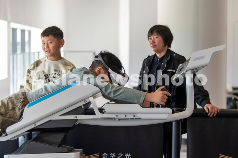 图片说明:2025年4月6日,浙江省金华市科技馆里,青少年正在体验“自由飞行”科普项目。