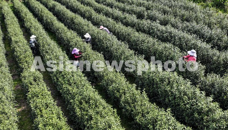 2025年4月5日,安徽省合肥市庐江县汤池镇马槽村村民抓紧春日晴好天气,正在茶山上采收谷雨节气前的“雨前茶”。