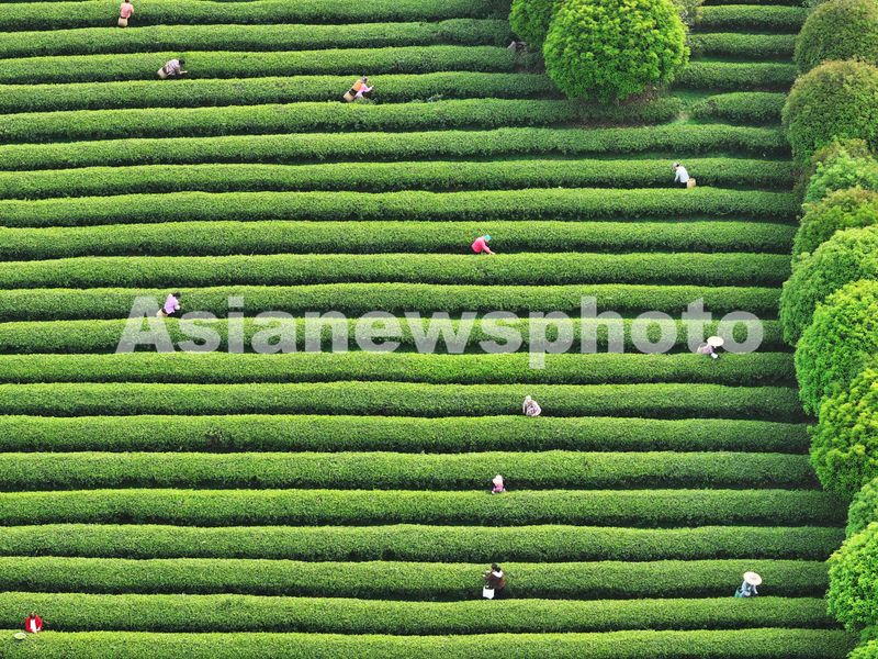 图片说明:4月6日,茶农在广西昭平县昭平镇马圣村一有机茶种植基地采摘春茶。