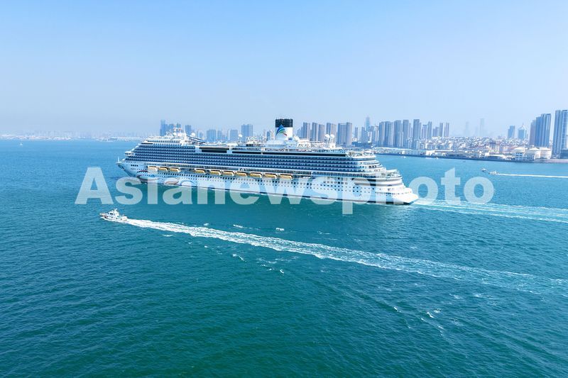 2025年4月6日,山东青岛胶州湾航道,“爱达・魔都”号邮轮缓缓驶入青岛邮轮母港。青岛是“爱达・魔都”号邮轮中国海岸巡游离沪运营首站,也是“爱达・魔都”号首次于上海以外的中国港口城市亮相。