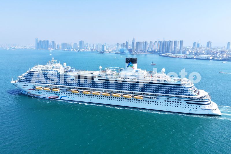2025年4月6日,山东青岛胶州湾航道,“爱达・魔都”号邮轮缓缓驶入青岛邮轮母港。青岛是“爱达・魔都”号邮轮中国海岸巡游离沪运营首站,也是“爱达・魔都”号首次于上海以外的中国港口城市亮相。