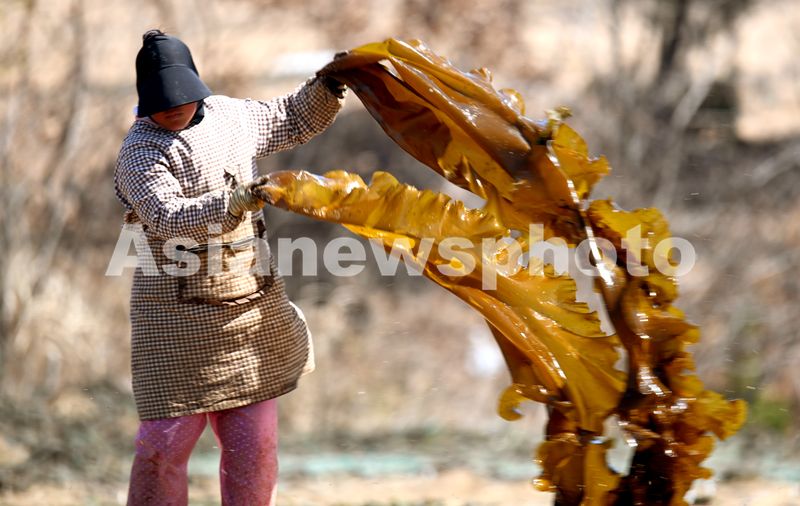 2025年4月7日,山东省荣成市成山镇马山脚下,工人正在晾晒海带。