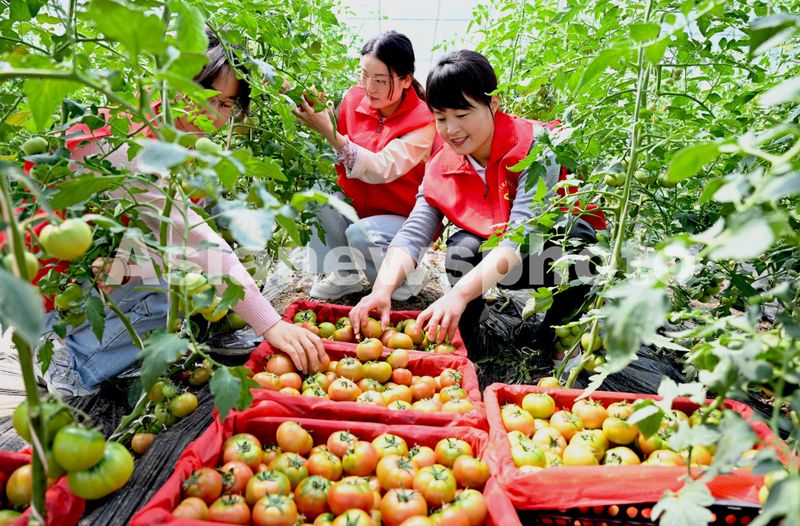 4月10日,在安徽省亳州市利辛县汝集镇青优雾耕现代产业园,党员志愿者在帮助菜农采收草莓番茄,供应市场。