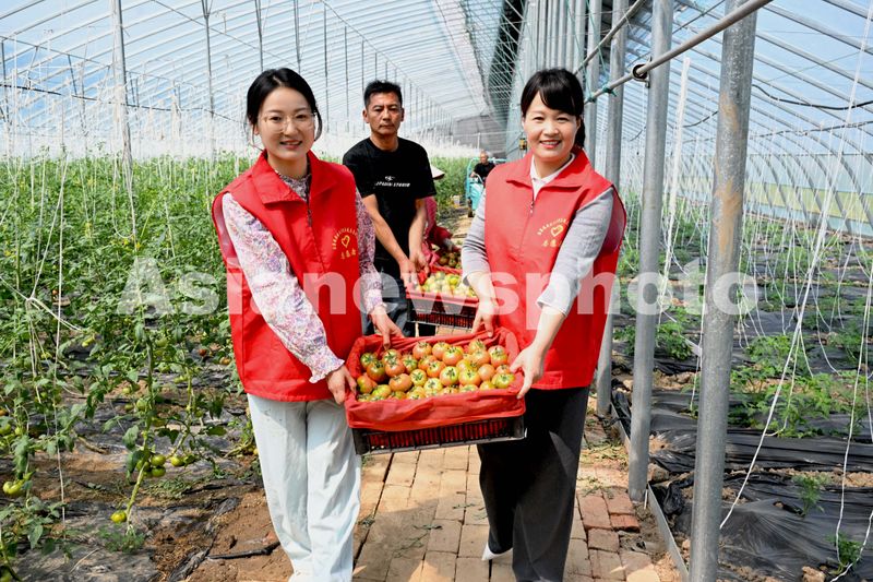 2025年4月10日,在安徽省亳州市利辛县汝集镇青优雾耕现代产业园,党员志愿者在帮助菜农采收草莓番茄,供应市场。
