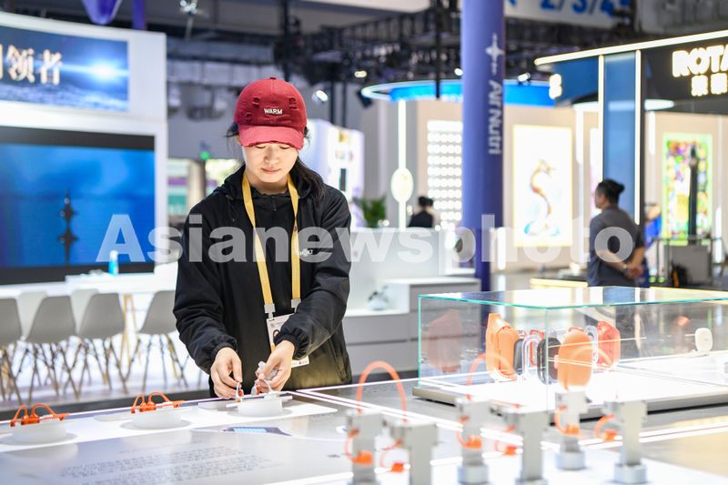 图片说明:2025年4日10日,在海南国际会展中心,第五届中国国际消费品博览会韶音展馆内,工作人员正在布置展品。