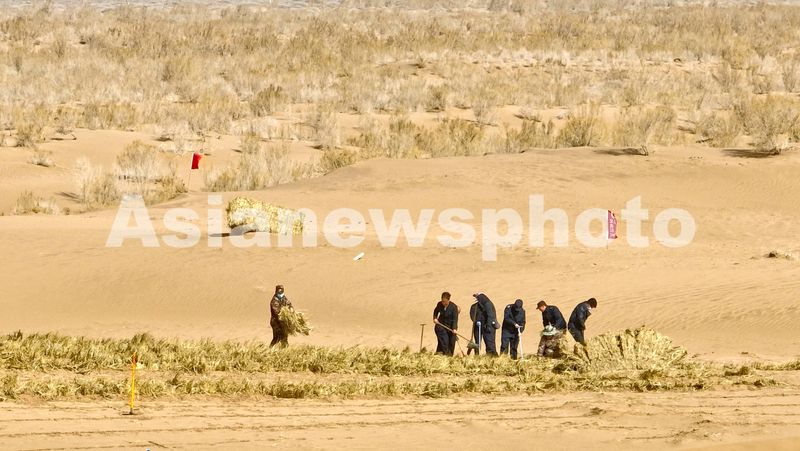 图片说明:2025年4月11日,甘肃省张掖市临泽县平川镇北部干旱荒漠区,干部职工和志愿者们在用稻草营建阻沙网。