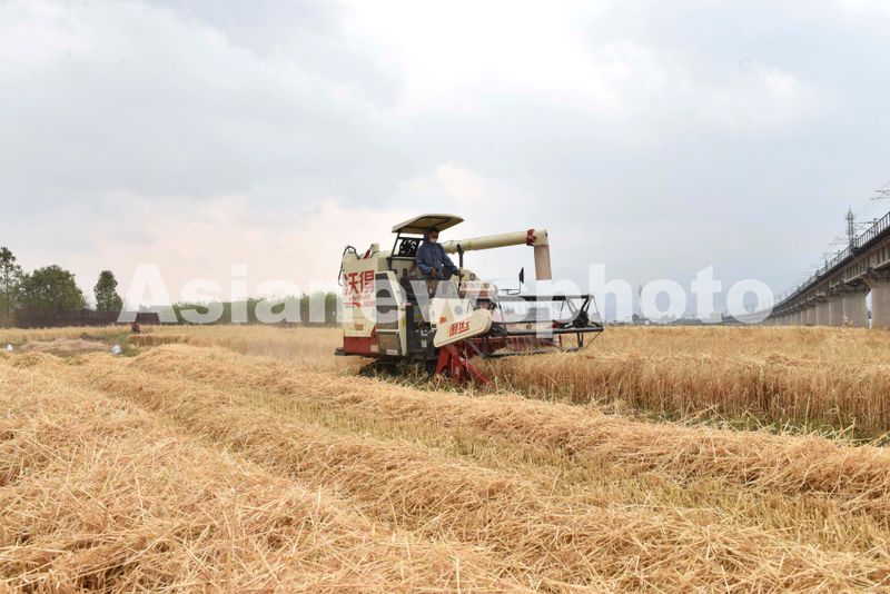 图片说明:2025年4月11日,云南省大理州巍山县庙街镇添泽村田间,农机手驾驶收割机抢收大麦。