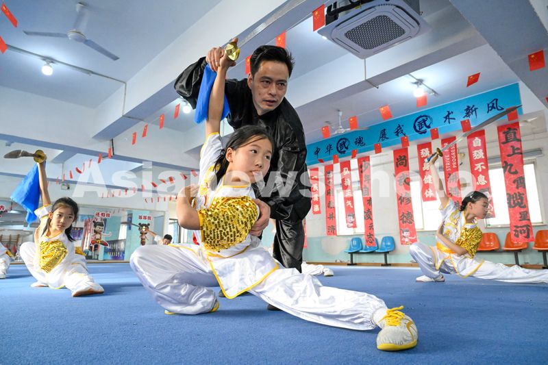 图片说明:2025年4月11日,在安徽省合肥市庐阳区双岗街道虹桥小学,小学生在老师的指导下学习传统武术。