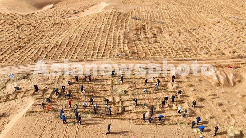图片说明:2025年4月11日,甘肃省张掖市临泽县平川镇北部干旱荒漠区,干部职工和志愿者们在用稻草营建阻沙网。