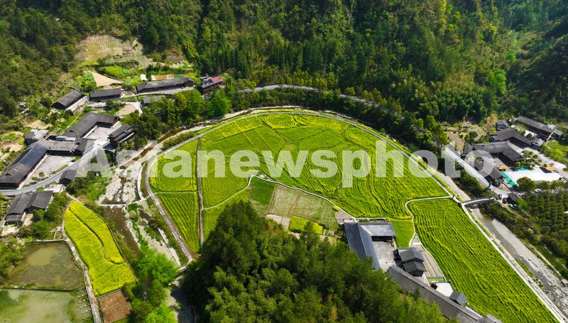 图片说明:2025年4月10日,重庆市黔江区小南海镇新建村土家十三寨的油菜花田与民居相间,美不胜收。