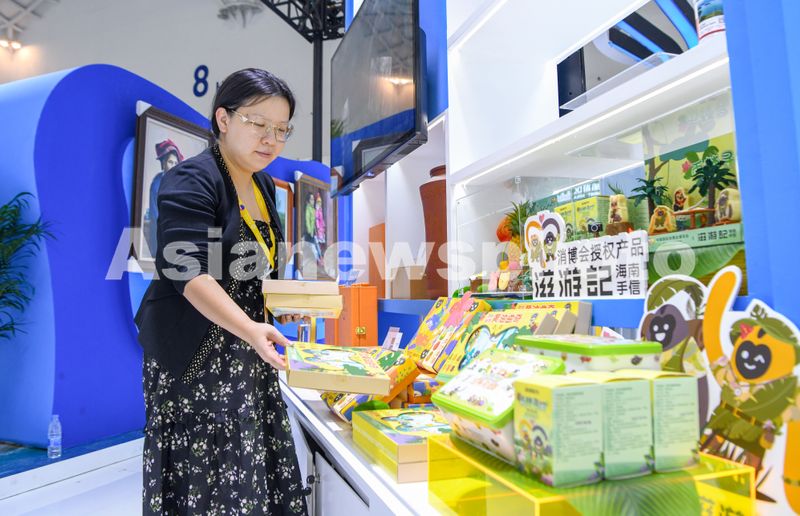 图片说明:2025年4日10日,在海南国际会展中心,第五届中国国际消费品博览会海南馆内,展架上布置的海南特色伴手礼玲琅满目。