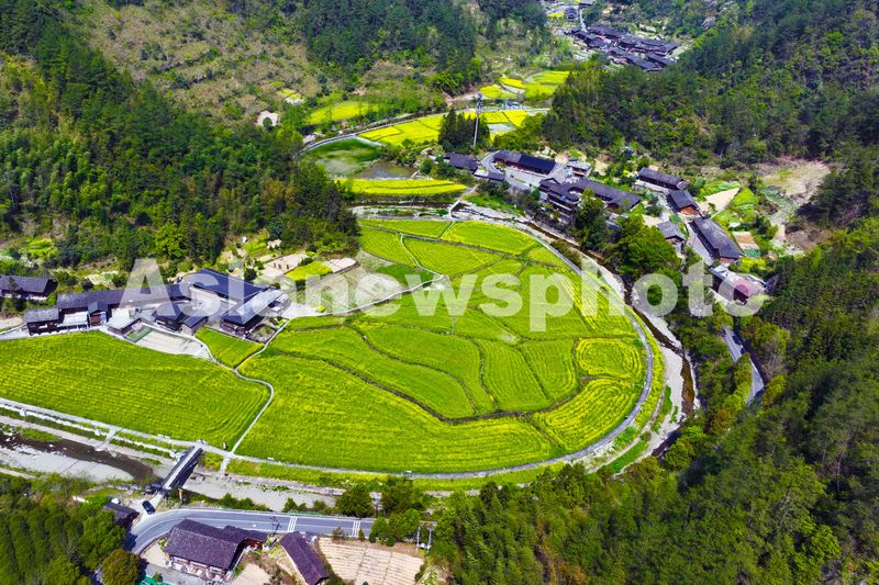 图片说明:2025年4月10日,重庆市黔江区小南海镇新建村土家十三寨的油菜花田与民居相间,美不胜收。