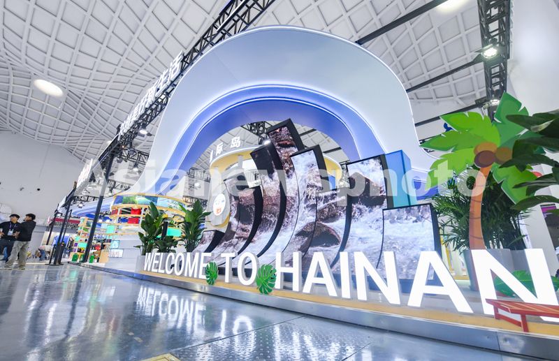 图片说明:2025年4日10日,在海南国际会展中心,第五届中国国际消费品博览会海南馆已完成搭建,展品正在布展中。