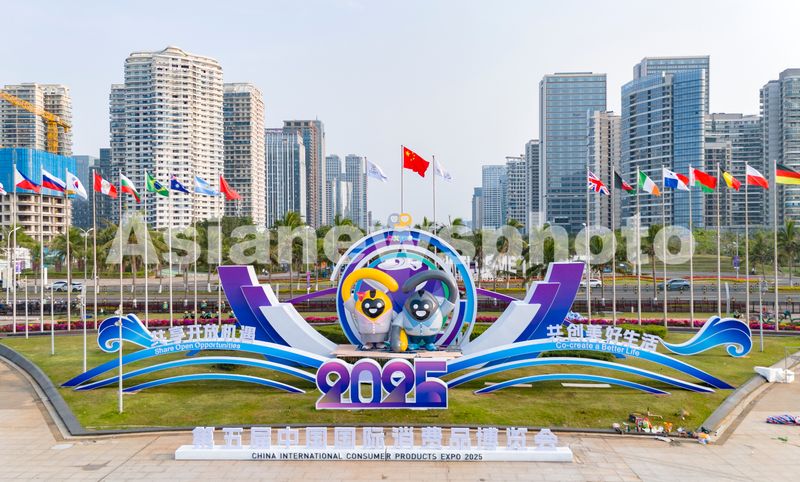 图片说明:2025年4月10日,航拍海南省海口市海南国际会展中心,装扮一新迎接第五届消博会。