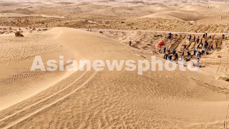 图片说明:2025年4月11日,甘肃省张掖市临泽县平川镇北部干旱荒漠区,干部职工和志愿者们在用稻草营建阻沙网。