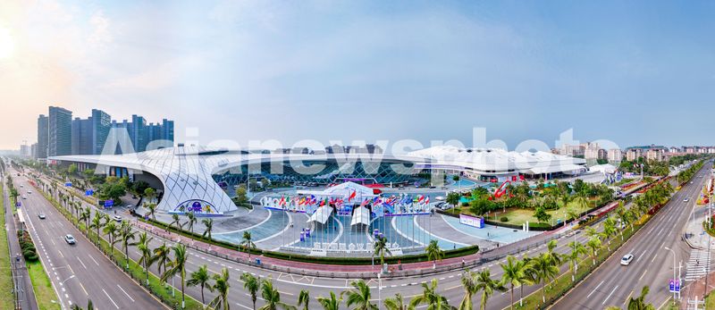 图片说明:2025年4月10日,航拍海南省海口市海南国际会展中心,装扮一新迎接第五届消博会。