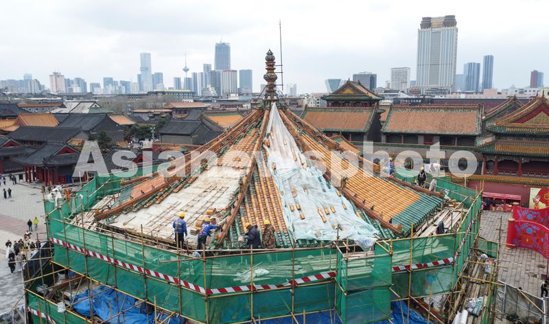 图片说明:4月13日,施工人员在沈阳故宫大政殿顶部进行作业。