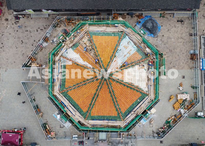 图片说明:4月13日,施工人员在沈阳故宫大政殿顶部进行作业。