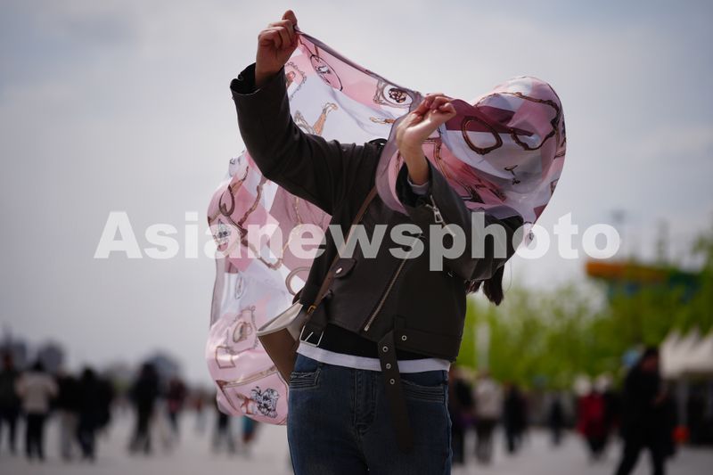 图片说明:4月12日,北京奥林匹克公园,游客头戴纱巾出行。