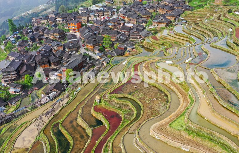 2025年4月13日,春耕时节,国家湿地公园贵州省黔东南苗族侗族自治州从江县加榜梯田进入春耕期,梯田蓄水丰盈、线条分明、色彩斑斓,层层叠叠的梯田与特色村寨、葱郁山林构成了一幅层次分明、和谐自然的田园画卷。